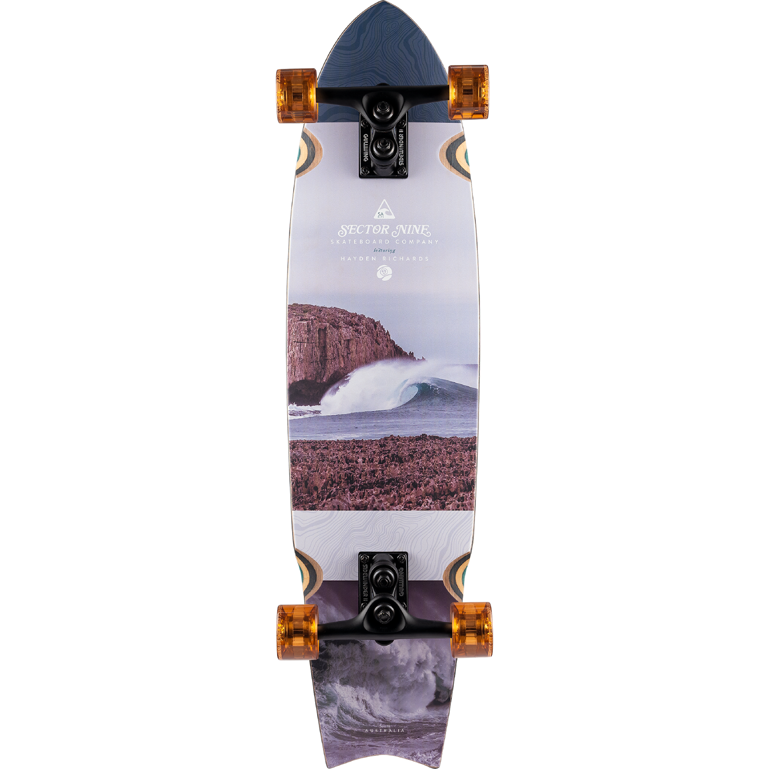 9.0” Gullwing Sidewinder II Trucks - 58mm 78a Nineballs - ABEC 5 Greaseball Bearings - 0.25” Recycled Plastic Risers - 1.25” Hardened Steel Bolts - Clear Grip on Tail Over Exposed Dyed Maple - Kicktail - Photography by Hayden Richards